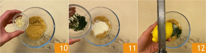 Transfira a farinha de rosca tostada para uma tigela e deixe esfriar, depois tempere com o alho picado 10, o Parmigiano Reggiano DOP ralado, as folhas picadas de aipo e salsinha 11, e a casca ralada do limão 12.