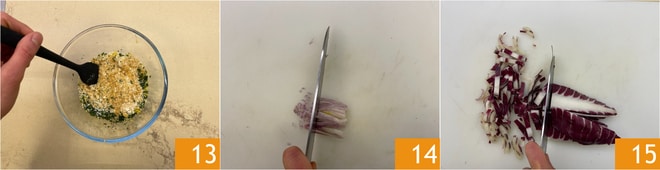 Adicione sal, pimenta e misture, depois reserve 13. Limpe e pique a cebola échalote 14. Limpe o radicchio eliminando a base mais rígida, depois fatie finamente 15.