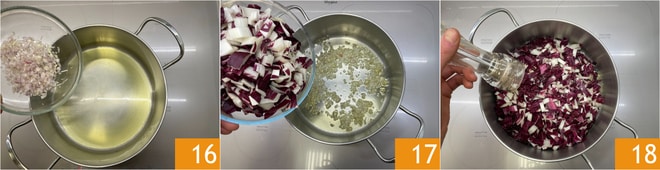 Em uma panela, despeje o óleo e a échalote 16, deixe dourar em fogo baixo e adicione o radicchio 17. Adicione sal, pimenta 18 e cozinhe por 5 minutos. Transfira o radicchio cozido para uma tigela.