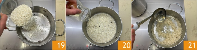 Na mesma panela, toste o arroz a seco 19. Regue com o vinho 20 e deixe evaporar. Cozinhe o arroz adicionando uma concha de caldo de cada vez, esperando sempre que a anterior seja absorvida antes de adicionar a próxima 21.