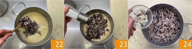 Após cerca de 7-8 minutos, adicione o radicchio 22, adicione sal 23 e continue cozinhando por mais 7-8 minutos. Quando estiver cozido, retire do fogo e misture com a manteiga de anchovas fria da geladeira 24.