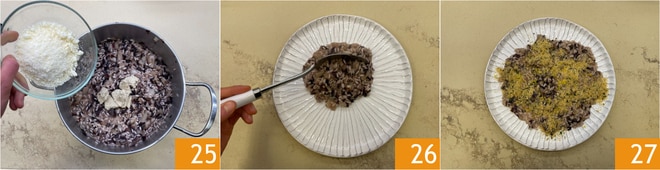 Adicione também o Parmigiano Reggiano DOP ralado 25 e misture para obter uma consistência cremosa. Emprate o risoto 26 e complete com as migalhas de pão aromático e casca de limão. Seu risoto com radicchio, manteiga de anchovas e pão aromático está pronto para ser servido 27!