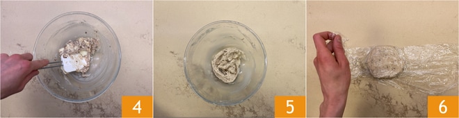 Misture com uma espátula 4 para criar uma mistura cremosa 5. Envolva a mistura em filme plástico 6 e coloque na geladeira por cerca de 30 minutos.