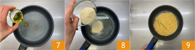 Em uma frigideira, aqueça o óleo 7, em seguida adicione a farinha de rosca 8 e toste até dourar 9.