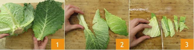 Para preparar o risoto com repolho, speck e fontina comece pela limpeza da verdura. Folheie o repolho até chegar às folhas mais tenras 1. Neste ponto, retire 180 g das folhas mais tenras 2 e corte-as em tiras finas 3.