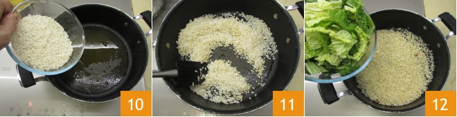 Na mesma panela, despeje o arroz 10 e toste em fogo alto por 2-3 minutos 11. Uma vez que se torne transparente, adicione o repolho 12.