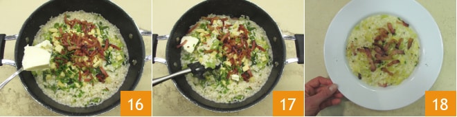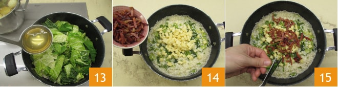 Cozinhe o risoto, regando de vez em quando com uma concha do caldo que você preparou; ajuste o sal 13. No final do cozimento, e fora do fogo, adicione a fontina, o speck 14, a cebolinha picada com a tesoura 15.