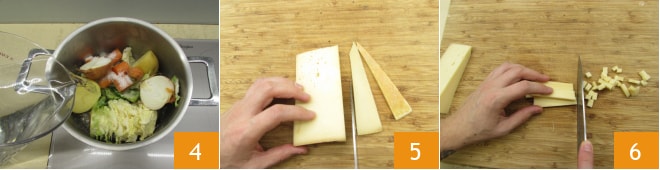 Despeje os restantes 320 g de descarte em uma panela junto com a cenoura, a batata e a cebola, que você já terá descascado e cortado em pedaços grandes. Cubra com bastante água e adicione o sal grosso, depois deixe ferver em fogo baixo por pelo menos 30 minutos 4. Enquanto isso, remova a casca do queijo 5 e corte-o em cubinhos 6.