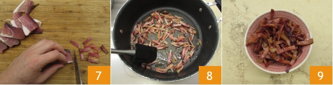 Reduza o speck em tiras de meio centímetro 7 e passe para o cozimento. Transfira o speck para uma panela e deixe refogar em fogo baixo por 5 minutos, mexendo de vez em quando 8. Quando estiver dourado, reserve 9.