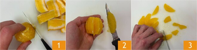 Para preparar o risoto com salsinha, laranja e amêndoas torradas, a primeira coisa a fazer é descascar as laranjas 1 e retirar os gomos 2. Se forem muito grandes, corte-os ao meio 3.