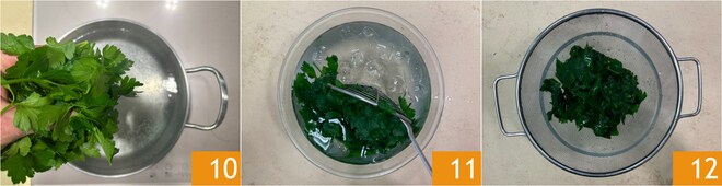 Branqueie a salsinha, por alguns segundos, em água levemente salgada 10. Escorra e coloque em uma tigela com água e gelo 11. Após alguns minutos, escorra bem 12.