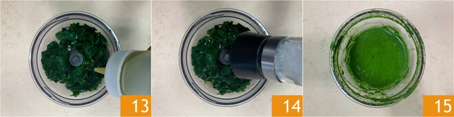 Transfira a salsinha para um liquidificador, tempere com óleo 13 e sal 14. Junte a água e bata até obter uma mistura homogênea 15.