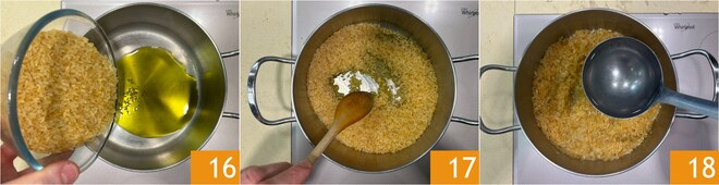 Em uma panela, coloque um fio de óleo, o arroz 16 e refogue por alguns minutos 17. Adicione o vinho branco e, quando toda a parte alcoólica tiver evaporado, adicione uma concha de água levemente salgada 18 ou caldo de legumes. Adicione uma concha de água toda vez que o arroz tiver absorvido a anterior.