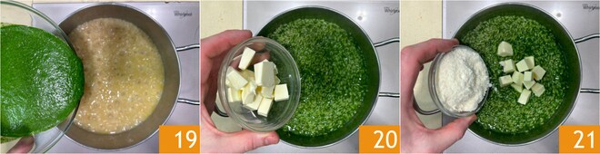 Quando o arroz estiver ¾ cozido, adicione o molho de salsinha 19 e finalize o cozimento. Desligue o fogo, adicione a manteiga 20 e o Parmesão 21 para finalizar.