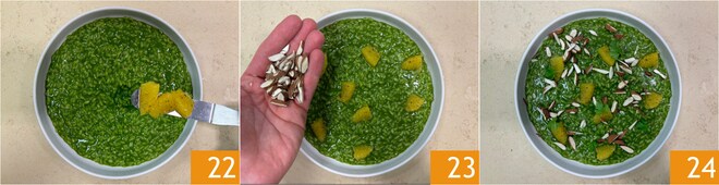 Sirva, coloque sobre o risoto as laranjas 22, as amêndoas torradas 23 e algumas folhas de salsinha. Seu risoto com salsinha, laranja e amêndoas torradas está pronto para ser servido 24.