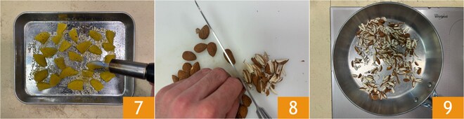 Passe um maçarico 7 na superfície dos gomos até que estejam levemente caramelizados e reserve. Se não tiver um maçarico, você pode assá-los no forno, no modo grill, a 200°C por 5 minutos. Pique as amêndoas 8 e toste-as na frigideira por 2 minutos em fogo médio-alto 9.