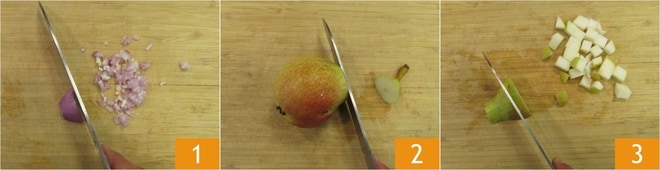 Para preparar o risoto com stracchino, peras e avelãs, limpe e fatie a cebola. Lave as peras, retire o cabo 2, corte-as ao meio, remova o miolo e, sem descascá-las, corte-as em cubos de cerca de 1 cm 3.