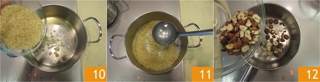 Adicione o arroz 10 e toste até ficar transparente, por cerca de 2 minutos. Em seguida, adicione aos poucos a água fervente, uma concha de cada vez, cozinhando por 10 minutos 11. Enquanto isso, à parte, toste as avelãs em uma frigideira pequena 12.