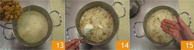 Após os 10 minutos de cozimento, adicione as peras ao arroz 13 e continue cozinhando por mais 8 minutos. Ao final do cozimento, desligue o fogo, misture com o stracchino 14 e perfume com o alecrim 15.