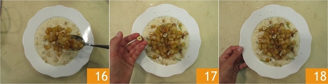 Sirva o arroz com as peras restantes 16, as avelãs tostadas 17 e pimenta a gosto. O risoto com peras, stracchino e avelãs está pronto para ser servido 18.