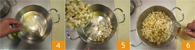Aqueça um fio de óleo em uma panela 4, adicione as peras 5 e cozinhe por 2 minutos em fogo alto. Flambe as peras com o rum 6.