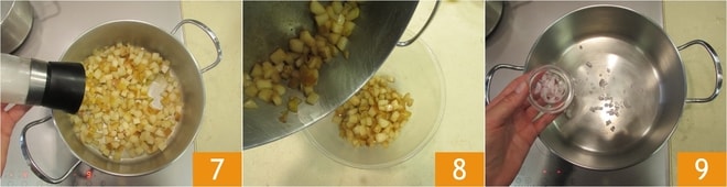 Salgue 7, cozinhe por mais 3 minutos e reserve 8. Na mesma panela, doure a cebola picada 9.