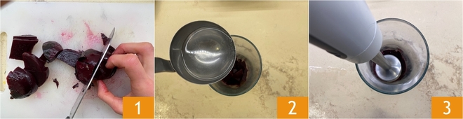 Para preparar o risoto cremoso com caponata siciliana, corte em pedaços a beterraba pré-cozida 1, coloque-a em uma jarra, adicione uma concha de água 2 e bata tudo com um mixer de imersão 3.