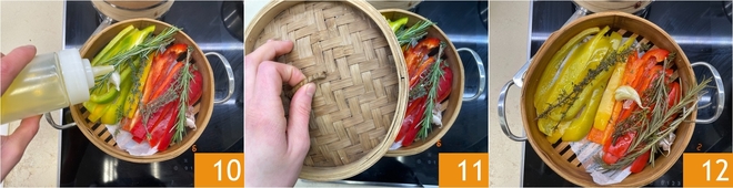 Corte-os em tiras 7 e faça o mesmo com os pimentões amarelos 8. Coloque no fogo a vaporeira de bambu, ponha uma folha de papel manteiga e disponha aí os pimentões 9.
