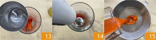 Transfira os pimentões vermelhos para a jarra com uma concha da água de cozimento 13 e um fio de azeite, bata 14 e coe através de uma peneira 15.