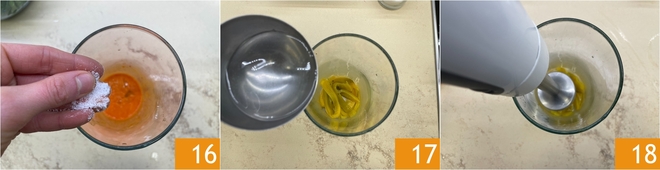 Tempere o molho obtido com uma pitada de sal 16. Faça o mesmo com os pimentões amarelos: coloque-os em uma jarra com uma concha de água 17 e bata-os 18.