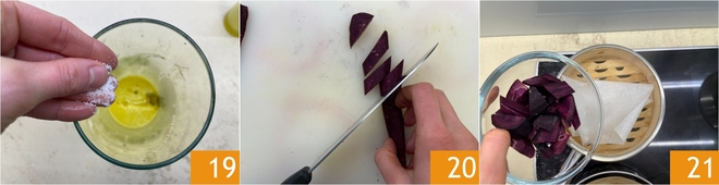 Coe e tempere com sal o molho amarelo 19. Ocupese agora das cenouras roxas: descasque-as e corte em pedaços 20. Proceda com o cozimento no vapor 21.