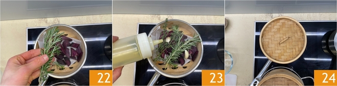 Tempere sempre com alecrim 22, tomilho, alho e um fio de azeite 23. Tampe com a tampa e cozinhe por 30 minutos 24.