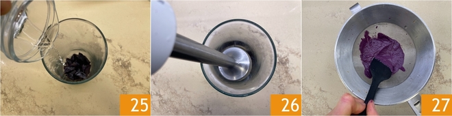 Uma vez cozidas, transfira as cenouras para a jarra com a concha de água habitual 25, bata 26 e coe 27.