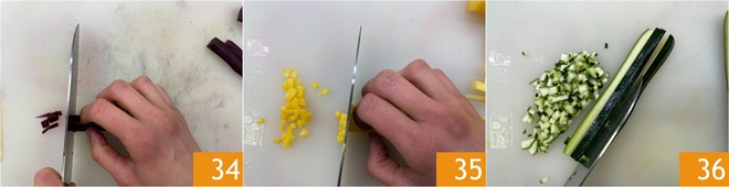 Agora cuide dos vegetais crus que farão a base do risoto: lave e corte em cubinhos bem pequenos as cenouras roxas 34, as cenouras amarelas 35 e a parte verde das abobrinhas 36.