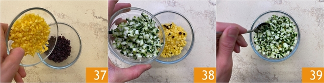 Em uma tigela coloque os cubinhos de cenoura 37 e de abobrinha 38, misture 39 e reserve.