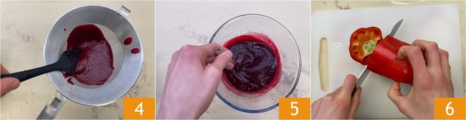 Coe o molho obtido através de uma peneira 4, tempere com sal, misture e reserve o primeiro molho 5. Limpe os pimentões vermelhos retirando o talo 6 e removendo os filamentos e as sementes internas.