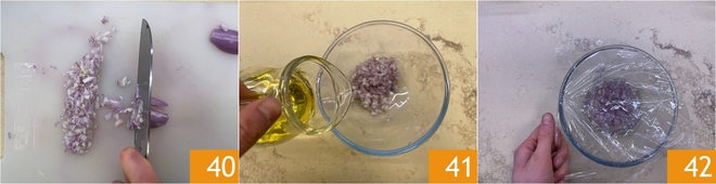 Prepare a chalota: limpe-a e corte-a em cubinhos sem amassar 40, caso contrário ficará amarga. Coloque-a em uma tigela com o azeite 41, cubra com filme próprio para micro-ondas 42 e cozinhe no micro-ondas por 10 segundos na potência máxima (cerca de 750 W). Retire a tigela e mexa a chalota, depois repita a mesma operação por mais 3 vezes. Desta forma a nota ácida será suavizada e ficará realçada apenas a doçura da chalota.