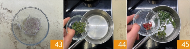 Reserve a chalota 43 e ocupe-se da infusão que servirá para cozinhar o risoto. Em uma panelinha coloque a água, o alecrim, a pipernia 44 e a pimenta rosa em grãos 45.
