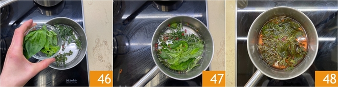 Adicione o manjericão 46 e aqueça a água, que não deve ultrapassar os 80 47. Deixe em infusão por uma hora 48.