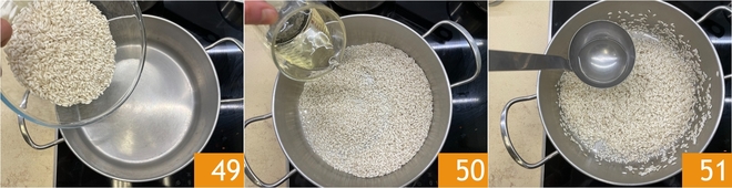 Cozinhe o arroz: em uma panela coloque o arroz e toste-o a seco 49, flambando com o vinho branco 50, deixe evaporar, depois comece o cozimento com um par de conchas de água quente 51, tempere com sal e cozinhe por 5-6 minutos.