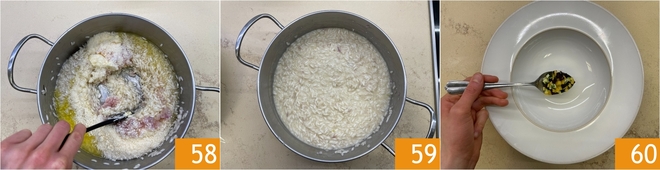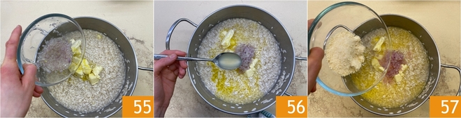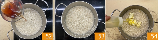 Prossiga o cozimento adicionando pouco a pouco a infusão pelos restantes 5-6 minutos 52; os tempos de cozimento dependem da qualidade do arroz. Uma vez cozido o arroz 53, manteque adicionando manteiga fria e azeite 54.
