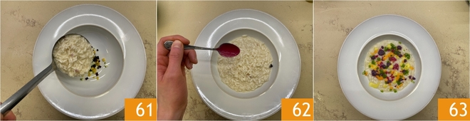 Cubra com o risoto 61 e distribua os molhos com uma colher de chá (ou você pode usar pequenos frascos dosadores) deixando-os cair em chuva 62. O risoto cremoso com caponata siciliana está pronto para ser apreciado 63!