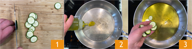 Para preparar o risoto de abobrinha e linguiça, comece aparando as abobrinhas e fatiando-as em rodelas finas 1. Coloque bastante azeite de oliva em uma frigideira 2 e, quando estiver bem quente, adicione um terço das abobrinhas 3.