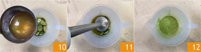 Adicione uma concha de caldo de legumes 10 e bata com um mixer de imersão 11 até obter um creme liso e homogêneo 12. Reserve.