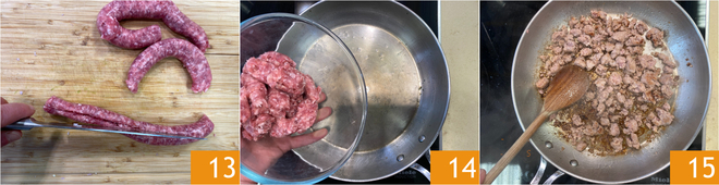 Vamos à linguiça: faça um corte 13 e remova a tripa. Aqueça a frigideira em que você cozinhou as abobrinhas, coloque a linguiça 14 e doure-a em fogo médio por alguns minutos, desfazendo-a com uma colher de pau 15. Uma vez cozida e dourada, retire do fogo e reserve.