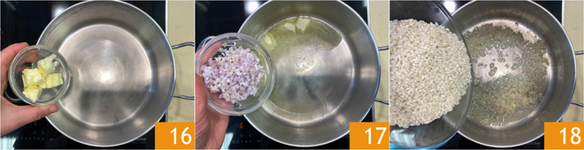 Agora dedique-se ao risoto: derreta a manteiga em uma caçarola 16, depois adicione a chalota finamente picada 17 e deixe murchar em fogo baixo por um par de minutos. Quando estiver translúcida, junte o arroz 18 e uma pitada de sal.