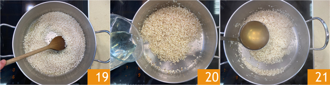 Toste o arroz por 1-2 minutos, mexendo frequentemente 19. Deglaceie com o vinho branco 20 e deixe evaporar completamente o álcool, depois cozinhe o arroz regando com uma concha de caldo quente por vez, certificando-se de que o líquido tenha sido absorvido antes de adicionar mais 21.