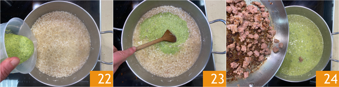 Depois de cerca de 10 minutos, junte aproximadamente dois terços do creme de abobrinha 22 e mexa para temperar o arroz de maneira uniforme 23. Incorpore também a linguiça dourada 24 e termine de cozinhar o risoto; levará mais 5 minutos.