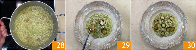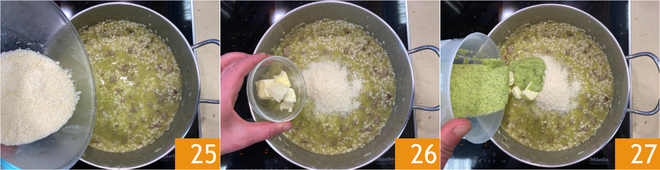 Quando estiver pronto, desligue o fogo e finalize mexendo com o Parmigiano Reggiano ralado 25, a manteiga fria 26 e o restante do creme de abobrinha 27.
