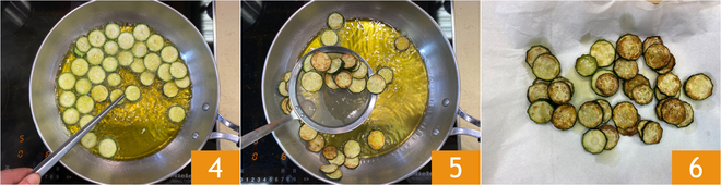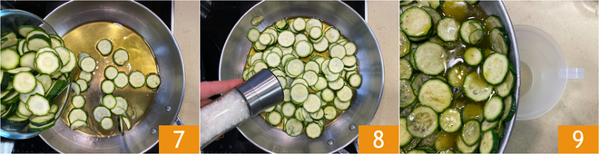 Na mesma frigideira coloque as abobrinhas restantes 7, tempere com sal 8 e cozinhe em fogo médio por cerca de 10 minutos. Quando estiverem macias, transfira as abobrinhas para um copo 9.